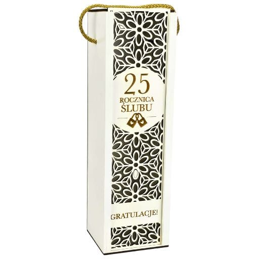Oryginalny prezent na 25 rocznicę ślubu Pasuje do butelek 0,5L – praktyczne wymiary Ażurowe zdobienia i jubileuszowy grawer Gotowa do wręczenia – opakowanie foliowe w zestawie Produkt polski – wysoka jakość wykonania