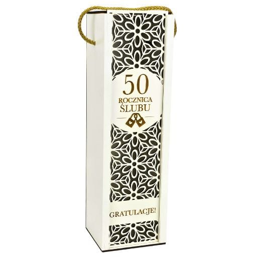 Oryginalny prezent na 50 rocznicę ślubu Pasuje do butelek 0,5L – praktyczne wymiary Ażurowe zdobienia i jubileuszowy grawer Gotowa do wręczenia – opakowanie foliowe w zestawie Produkt polski – wysoka jakość wykonania