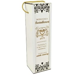 Solidna konstrukcja z białego materiału drewnopochodnego Ażurowe zdobienia i personalizowany grawer z podziękowaniem Wymiary 10 × 9 × 33 cm – pasuje na butelkę wina 0,5L Foliowe opakowanie – gotowa do wręczenia Produkt wykonany w Polsce przez Verde Factory