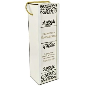 Solidna konstrukcja z białego materiału drewnopochodnego Ażurowe zdobienia i personalizowany grawer z podziękowaniem Wymiary 10 × 9 × 33 cm – pasuje na butelkę wina 0,5L Foliowe opakowanie – gotowa do wręczenia Produkt wykonany w Polsce przez Verde Factory