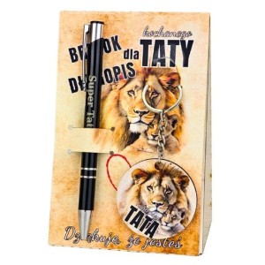 Metalowy długopis z grawerem "Super Tata" Brelok drewnopochodny – kolorowy nadruk, średnica 5 cm Kolorowe opakowanie + folia ochronna Gotowy do wręczenia prezent dla Taty Idealny produkt dla hurtowni, kwiaciarni i stoisk z upominkami Dostępny w sprzedaży hurtowej