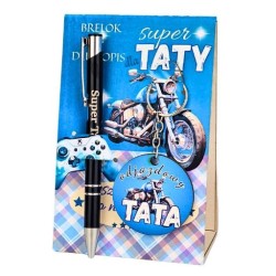 Metalowy długopis z grawerem "Super Tata" Brelok drewnopochodny – kolorowy nadruk, średnica 5 cm Kolorowe opakowanie + folia ochronna Gotowy do wręczenia prezent dla Taty Idealny produkt dla hurtowni, kwiaciarni i stoisk z upominkami Dostępny w sprzedaży hurtowej