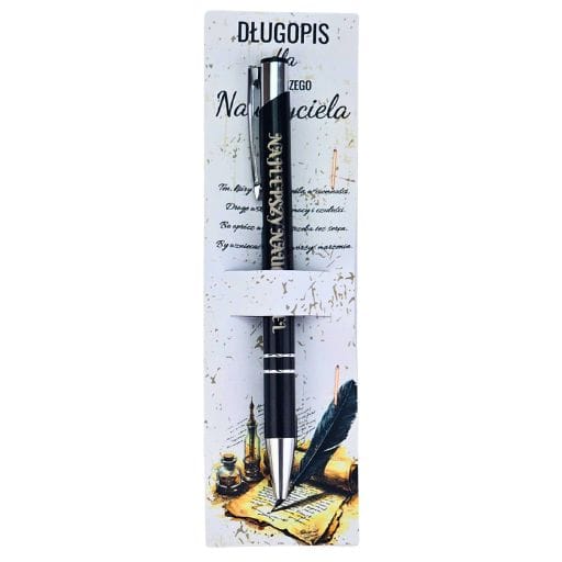 Metalowy długopis – czarny kolor Grawer: "Najlepszy Nauczyciel" Niebieski wkład – gotowy do użycia Kartonowe opakowanie prezentowe + folia Gotowy prezent edukacyjny