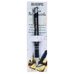Metalowy długopis – czarny kolor Grawer: "Najlepszy Nauczyciel" Niebieski wkład – gotowy do użycia Kartonowe opakowanie prezentowe + folia Gotowy prezent edukacyjny
