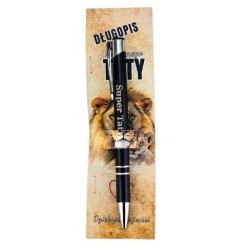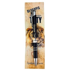 Metalowy długopis w kolorze czarnym Trwały grawer "Super Tata" Niebieski kolor wkładu Zapakowany w kartonik i folię Gotowy do wręczenia jako prezent