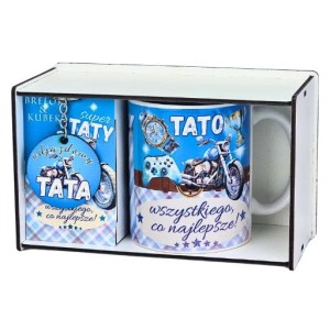 Zestaw prezentowy dla Taty: kubek + brelok Kubek ceramiczny 330 ml – kolorowy nadruk z obu stron Brelok drewnopochodny – średnica 5 cm, kolorowy nadruk Estetyczne pudełko z białego materiału drewnopochodnego + folia Idealny na Dzień Ojca, urodziny, święta Gotowy produkt do ekspozycji i sprzedaży