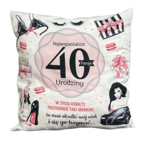 Poduszka okolicznościowa na 40 urodziny. Kolorowy nadruk. Zapakowana w folię. Wymiary 38 x 38 cm