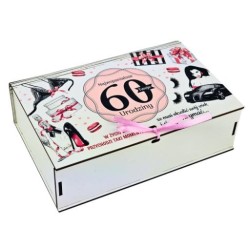 Pudełko z sześcioma przegródkami na gadżety z okazji urodzin. Kolorowy nadruk. Pudełko w przegródkach wypełnione wełną drzewną i żetonami; napisy na żetonach: NA ZDROWIE, NA PAMIĄTKĘ, NA PIERWSZY MILION, NA OSŁODĘ, NA SPEŁNIENIE MARZEŃ, NA SZCZĘŚCIE. Zapakowane w folię. Wymiary 22 x 15 x 6,5 cm