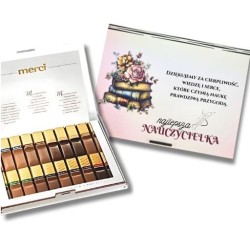 Rozmiar: 22 × 17 × 2 cm – pasuje do Merci Materiał: biały materiał drewnopochodny Kolorowy nadruk z podziękowaniami Gotowy do wręczenia – zapakowany w folię Produkt polski – wyprodukowany przez Verde Factory