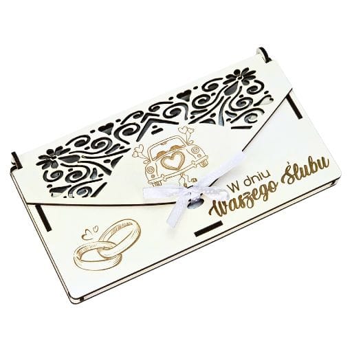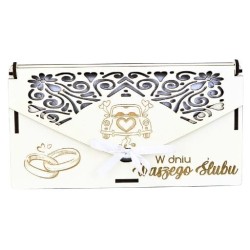 Ażurowe zdobienia – delikatny motyw ślubny wycięty z precyzją dodaje całości klasy i elegancji. Wytrzymały materiał – pudełko zostało wykonane z trwałego, białego materiału drewnopochodnego, co zapewnia jego solidność. Wnętrze z życzeniami – w środku znajduje się piękny nadruk z gotowymi życzeniami oraz przegródka na banknoty. Gotowe do wręczenia – zapakowane w przeźroczystą folię i przewiązane wstążką, co pozwala od razu podarować je jako prezent. Wymiary: 20,5 × 11 × 1,5 cm – idealne, by pomieścić standardowe banknoty i kartki okolicznościowe.