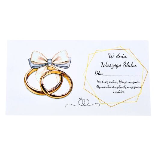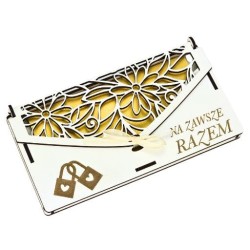 Ażurowe zdobienia – delikatny motyw ślubny wycięty z precyzją dodaje całości klasy i elegancji. Wytrzymały materiał – pudełko zostało wykonane z trwałego, białego materiału drewnopochodnego, co zapewnia jego solidność. Wnętrze z życzeniami – w środku znajduje się piękny nadruk z gotowymi życzeniami oraz przegródka na banknoty. Gotowe do wręczenia – zapakowane w przeźroczystą folię i przewiązane wstążką, co pozwala od razu podarować je jako prezent. Wymiary: 20,5 × 11 × 1,5 cm – idealne, by pomieścić standardowe banknoty i kartki okolicznościowe.