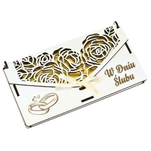 Ażurowe zdobienia – delikatny motyw ślubny wycięty z precyzją dodaje całości klasy i elegancji. Wytrzymały materiał – pudełko zostało wykonane z trwałego, białego materiału drewnopochodnego, co zapewnia jego solidność. Wnętrze z życzeniami – w środku znajduje się piękny nadruk z gotowymi życzeniami oraz przegródka na banknoty. Gotowe do wręczenia – zapakowane w przeźroczystą folię i przewiązane wstążką, co pozwala od razu podarować je jako prezent. Wymiary: 20,5 × 11 × 1,5 cm – idealne, by pomieścić standardowe banknoty i kartki okolicznościowe.