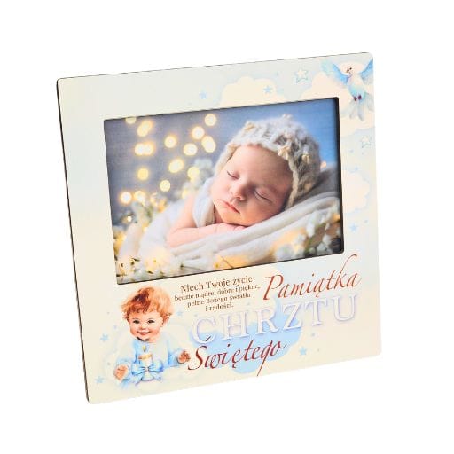 Ramka na zdjęcie pomoże upamiętnić uroczystość Chrztu Świętego. Kolorowy nadruk z życzeniami. Zapakowana w folię. Wymiary przedmiotu – 20 x 20 cm Rozmiar zdjęcia 15 x 10 cm.