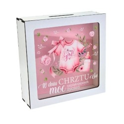 Skarbonka z okienkiem świetnie upamiętni uroczystość Chrztu Świętego . Kolorowy nadruk z życzeniami. Skarbonka z okienkiem z transparentnej plexi, które pozwala śledzić efekty oszczędzania. Zapakowane w folię. Wymiary 18 x 18 cm;