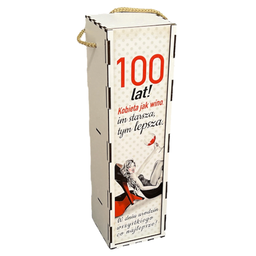 Skrzynka na butelkę dla kobiety z okazji urodzin. Kolorowy nadruk z życzeniami na urodziny. Pudełko pomieści butelkę wina lub innego alkoholu o pojemności 0,5 lub 0,7 l. Pakowane w folię. Wymiary 33,5 x 9,5 cm symbol produktu - 3311SZPILKA100