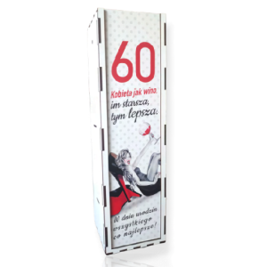 krzynka na butelkę dla kobiety z okazji urodzin. Kolorowy nadruk z życzeniami na urodziny. Pudełko pomieści butelkę wina lub innego alkoholu o pojemności 0,5 lub 0,7 l. Pakowane w folię. Wymiary 33,5 x 9,5 cm