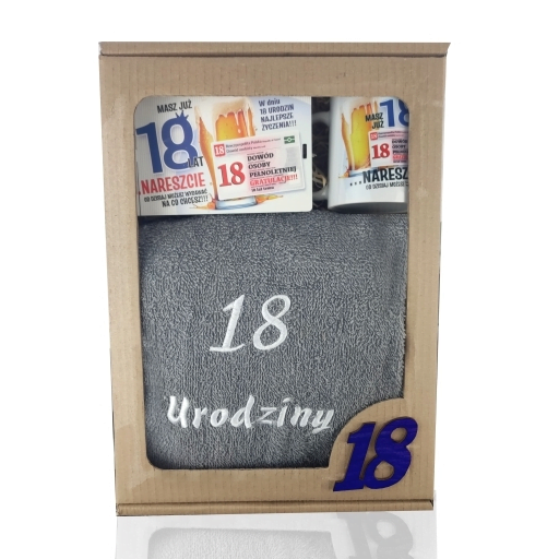 Zestaw upominkowy dla chłopaka kubek z nadrukiem + banknotówka + ręcznik z haftem. Kubek ceramiczny z nadrukiem dla chłopaka z okazji 18 urodzin. Nadruk dookoła kubka. Pojemność: 330 ml Pudełko na pieniądze - banknotówka z życzeniami. Rozmiar 9,5 x 16 cm Ręcznik z haftem 18 urodziny. Rozmiar: 100 x 50 cm. Kolor: biały, kremowy, szary, brązowy. symbol produktu - #3327 Dowód M