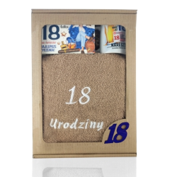 Zestaw upominkowy dla chłopaka kubek z nadrukiem + banknotówka + ręcznik z haftem. Kubek ceramiczny z nadrukiem dla chłopaka z okazji 18 urodzin. Nadruk dookoła kubka. Pojemność: 330 ml Pudełko na pieniądze - banknotówka z życzeniami. Rozmiar 9,5 x 16 cm Ręcznik z haftem 18 urodziny. Rozmiar: 100 x 50 cm. Kolor: biały, kremowy, szary, brązowy. symbol produktu - #3327 ELEGANT M