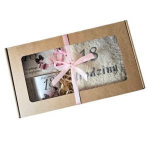 Zestaw upominkowy: kubek z nadrukiem + banknotówka + ręcznik z haftem. Kubek ceramiczny z nadrukiem z okazji urodzin. Nadruk dookoła kubka. Pojemność: 330 ml Pudełko na pieniądze - banknotówka z życzeniami. Rozmiar 9,5 x 16 cm Ręcznik z haftem na urodziny. Rozmiar: 100 x 50 cm. Kolor: biały, kremowy, szary, brązowy.