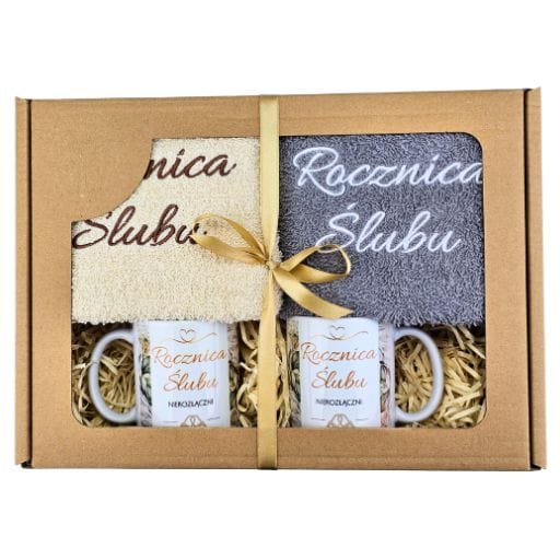 Zawartość zestawu: 2 x kubek + 2 x ręcznik Pojemność kubków: 330 ml Rozmiar ręczników: 50 x 100 cm Kolory ręczników: biały i szary Haft: napisy "Mąż" i "Żona" Pudełko: ekologiczne z okienkiem, folia, ozdobna wstążka Producent: Verde Factory – produkt polski